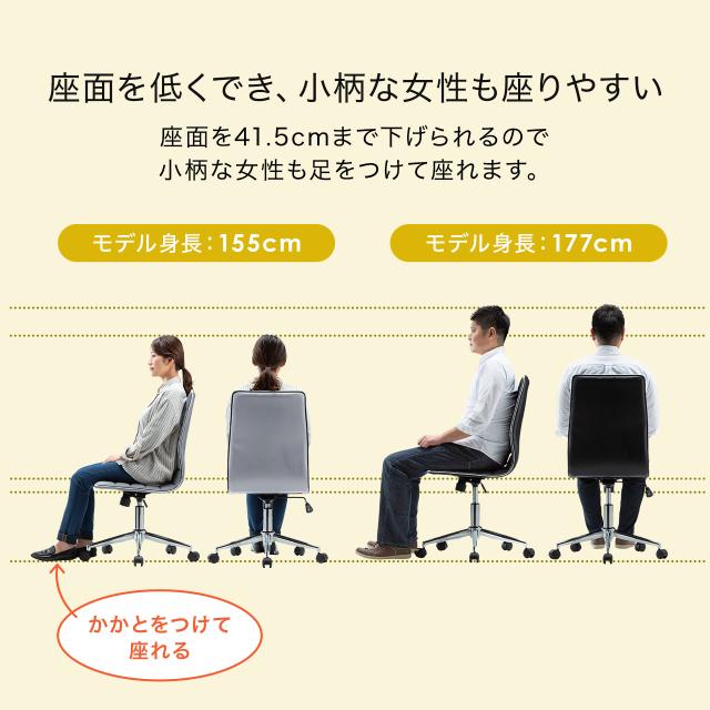 ●座面と背面の生地には手触りのよいPUレザーを採用しています。汗や水や汚れに強く、お手入れも簡単です。●身体に合わせた背もたれの曲線形状で、体にフィット感を与えます。