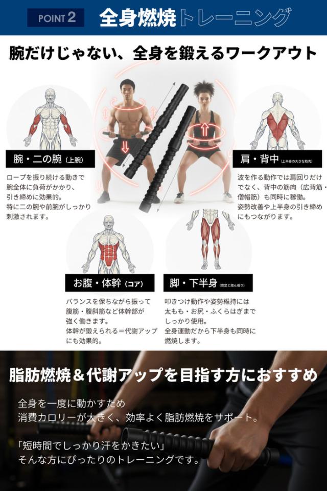 ロープを高速で動かし続けることで有酸素+無酸素運動の両方の効果が得られ、心拍数が上がりやすく、スタミナ強化につながります。
