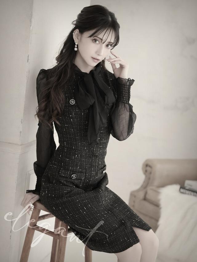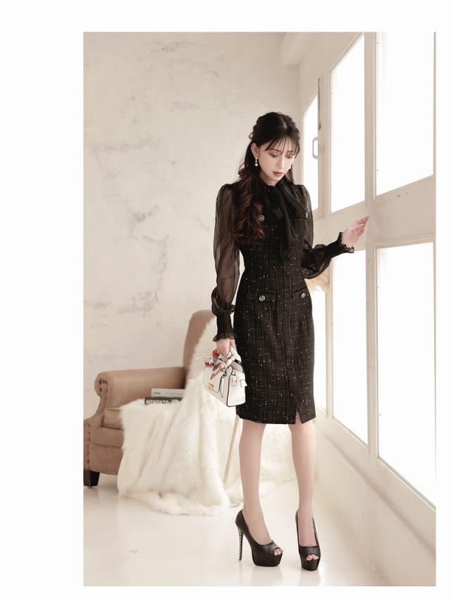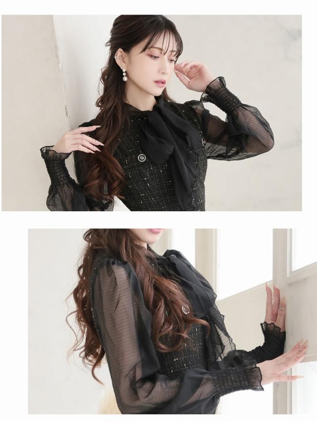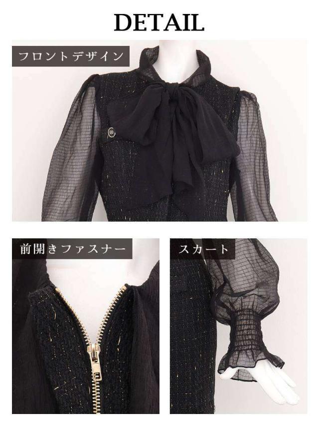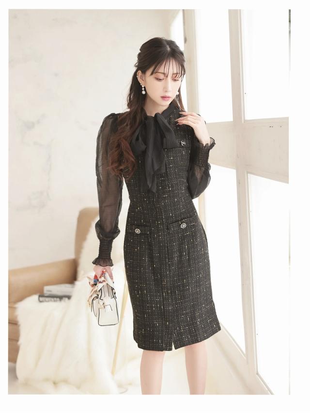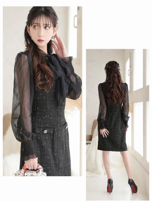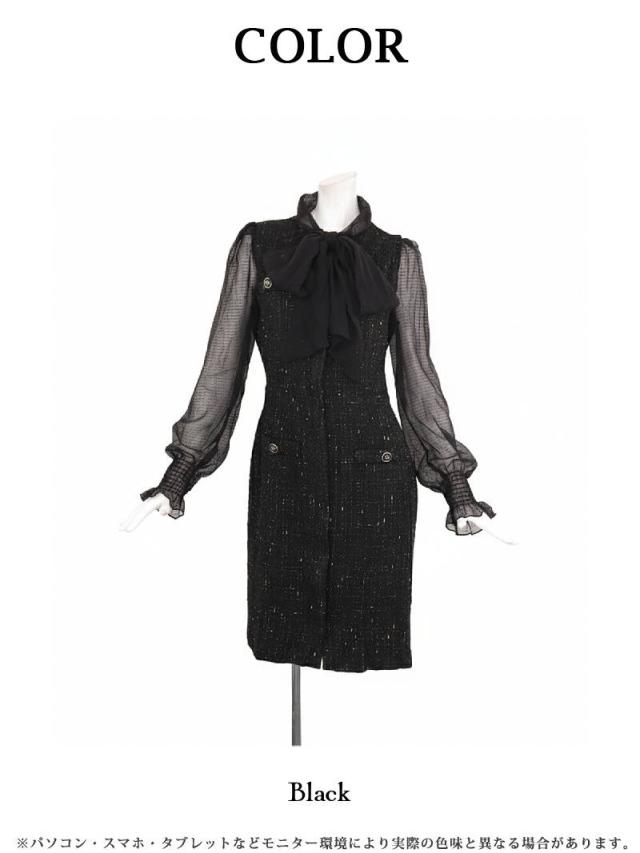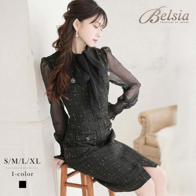 キャバワンピース Belsia 膝丈 フォーマルドレス シフォン袖 ツイード お呼ばれ キャバ ワンピース ワンピ キャバワン
