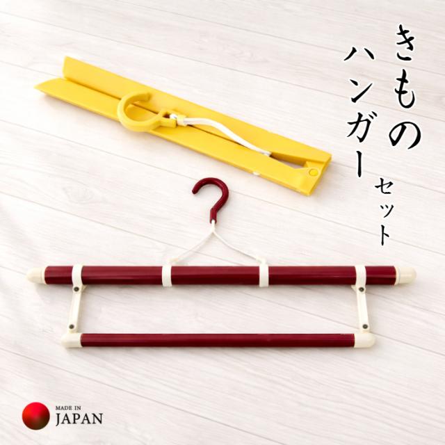 【着物ハンガー 2本セット(エンジ・黄色)】 きものハンガー 和装ハンガー 折りたたみ 伸縮式 帯掛けつき 衣紋掛け 虫干し シワ伸ばし 湿気とばし 衣裳ハンガー ユニフォームハンガー 子供着物ハンガー 日本製