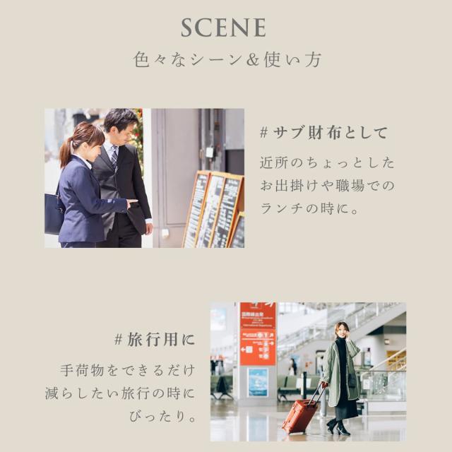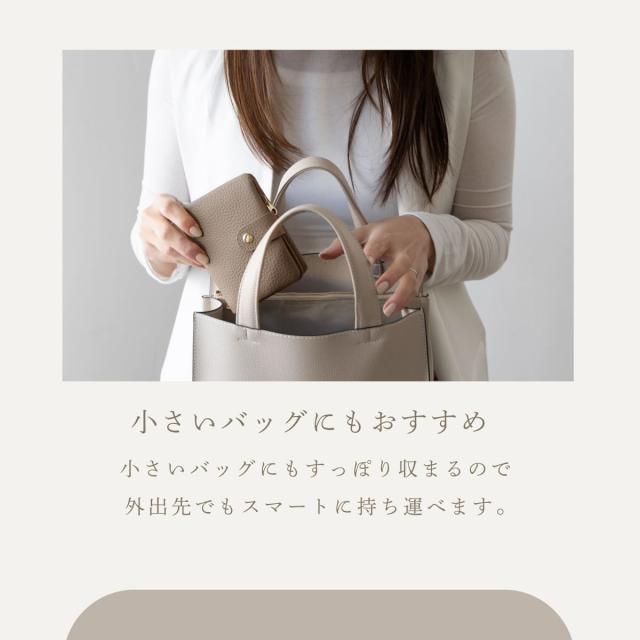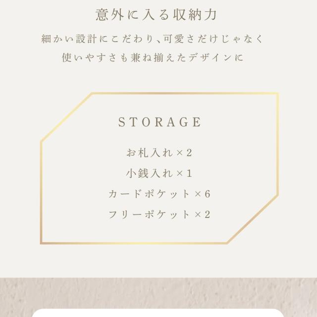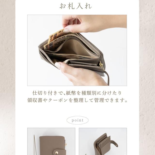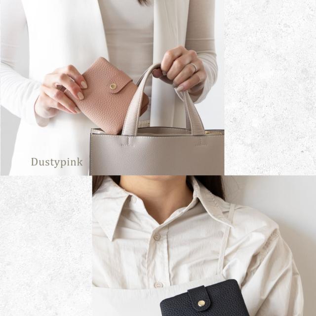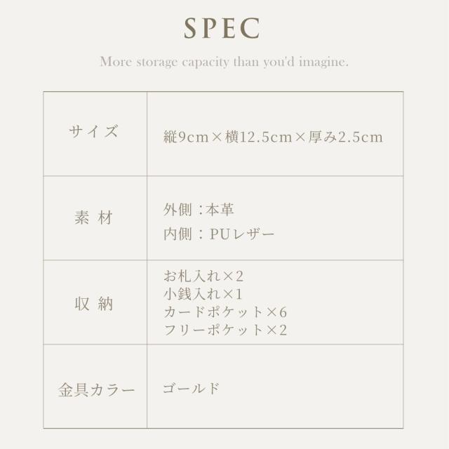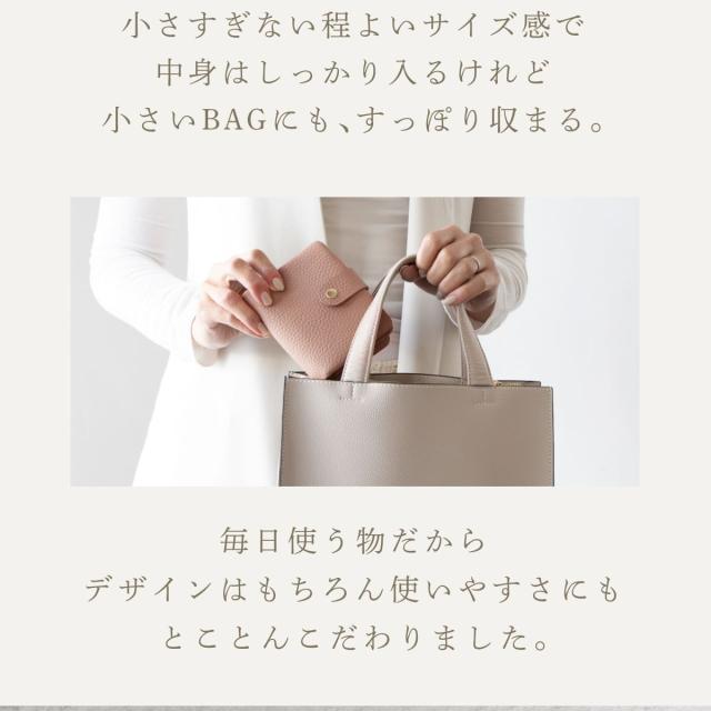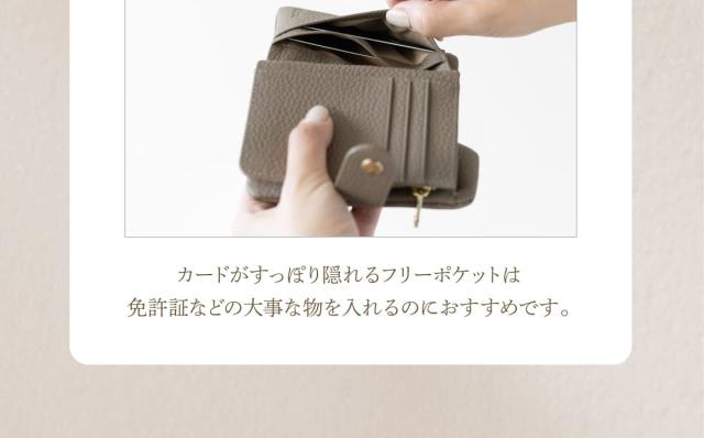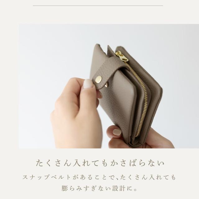 6箇所のカードポケットに、仕切り付きで整理しやすい小銭入れとお札入れ。見た目以上の大容量です。たくさん入れてもスナップベルトでしっかり留まるので、膨らみ過ぎずバッグにもすっきりと収まります。
