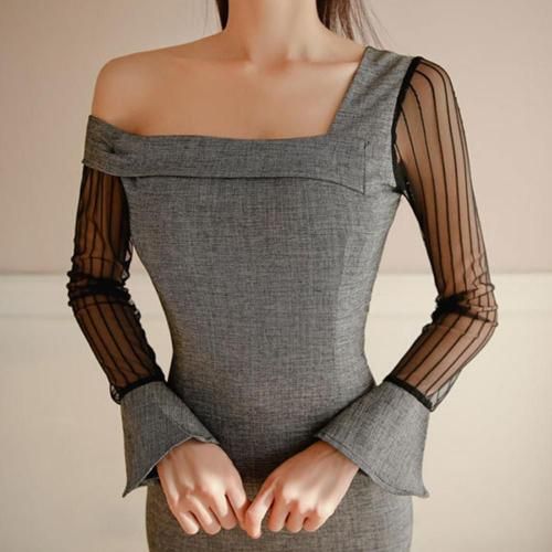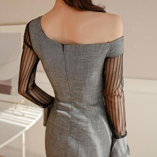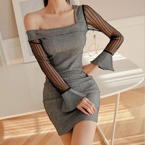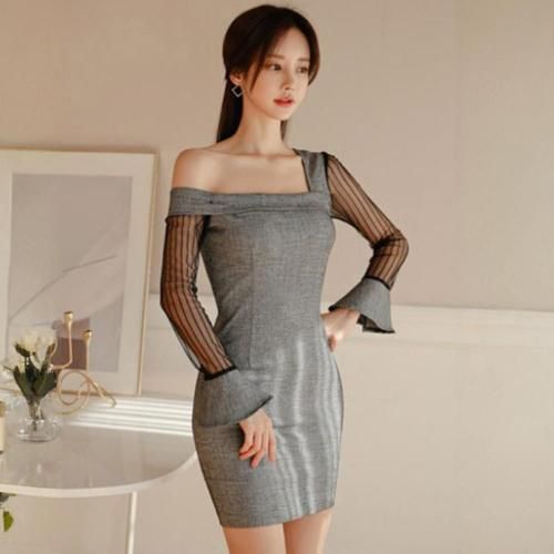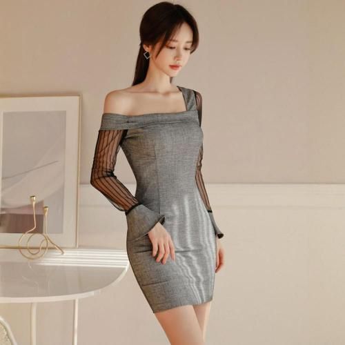 キャバ ドレス キャバドレス ワンピース ミニドレス ワンショルダー アシンメトリー エレガント ストライプ タイト フレア モダン シアー グレー S M L XL