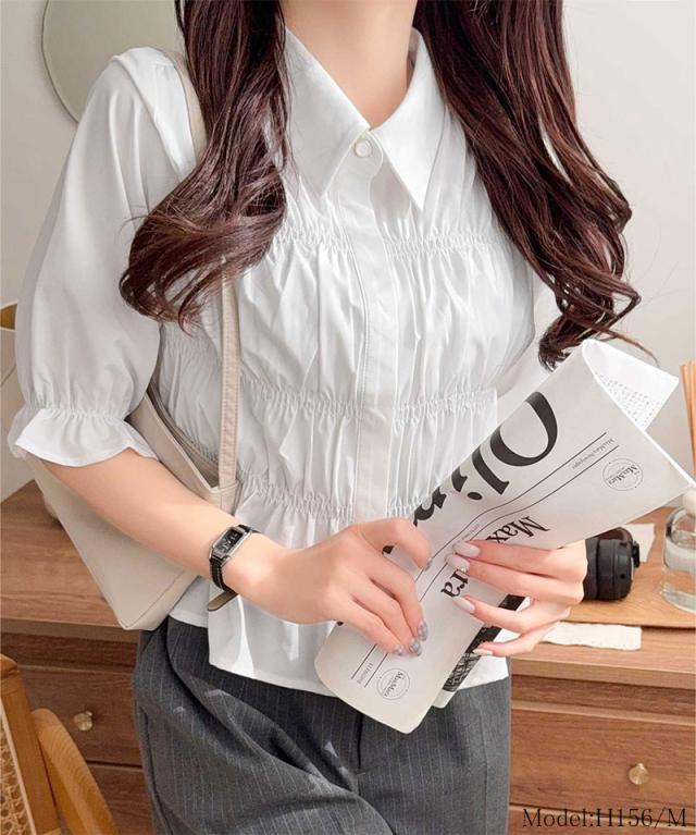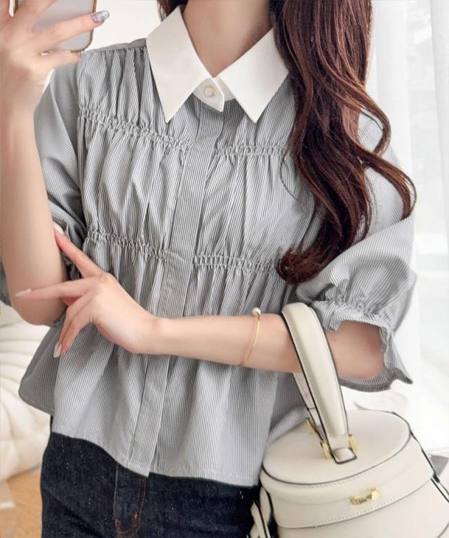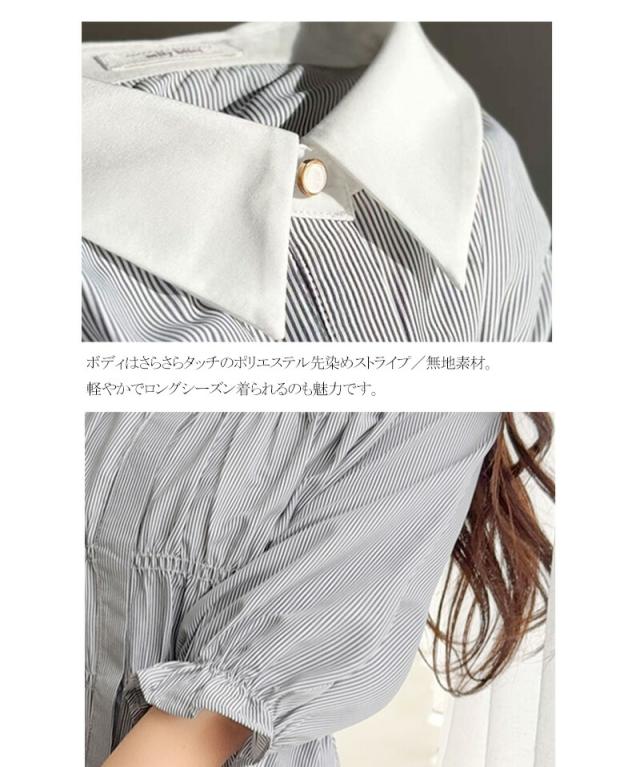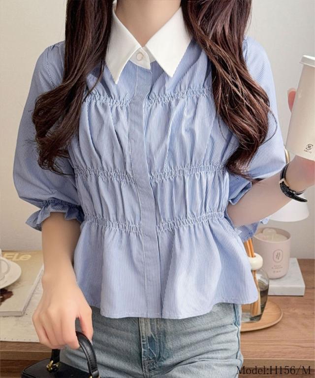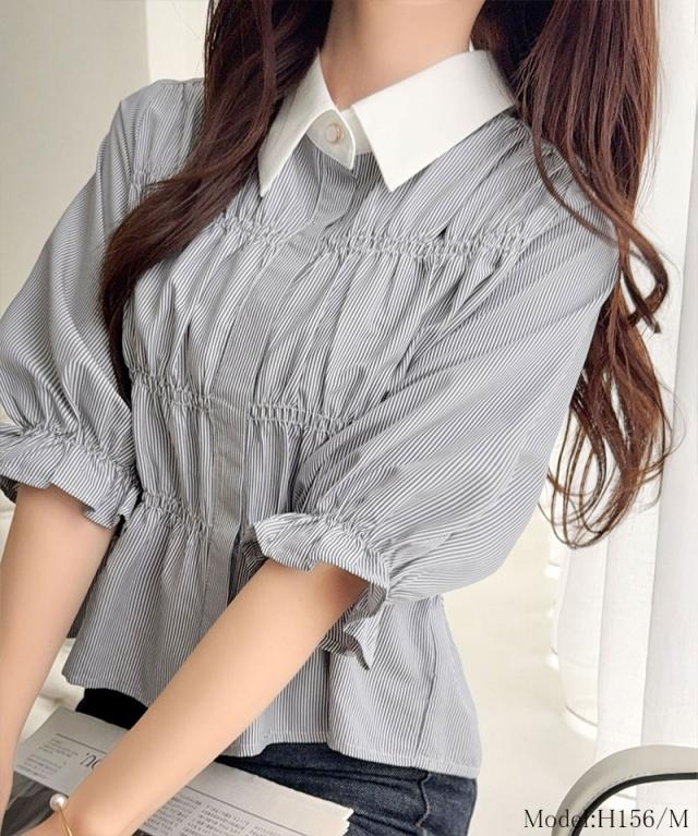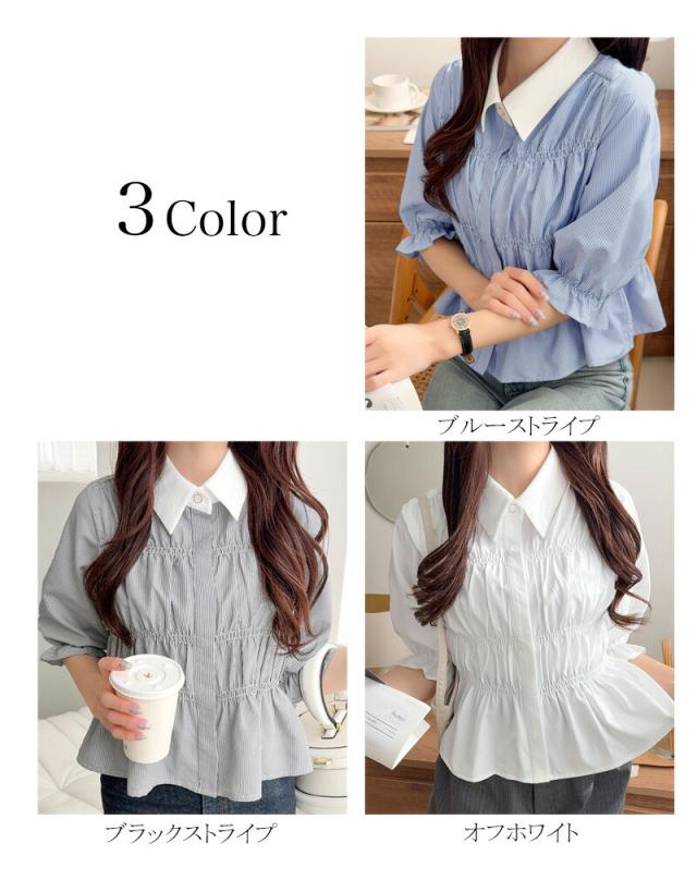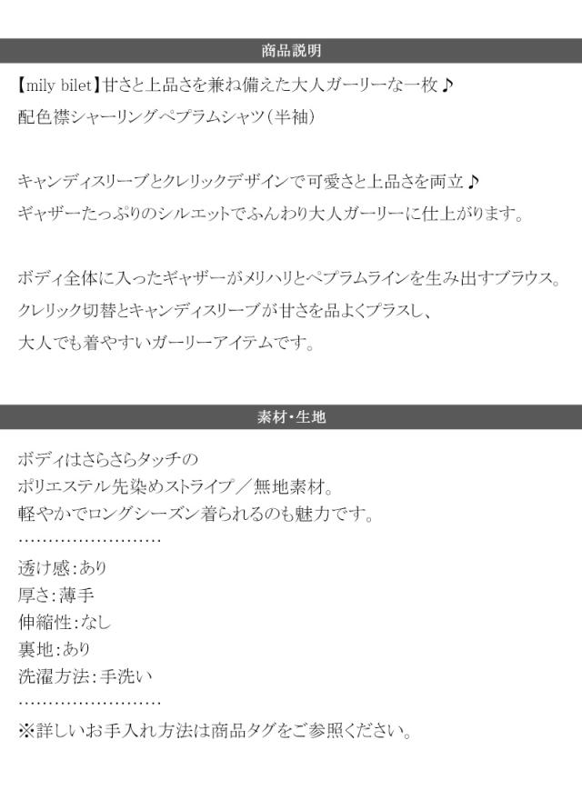 クラシカルエルフ春新作 mily bilet シャツブラウスレディース シャツ レディース おしゃれ トップス ガーリー 配色 襟 シャーリング ペプラ シャツ 半袖 キャンディスリーブ 二の腕カバー 大きいサイズ 2026ss mi1139107