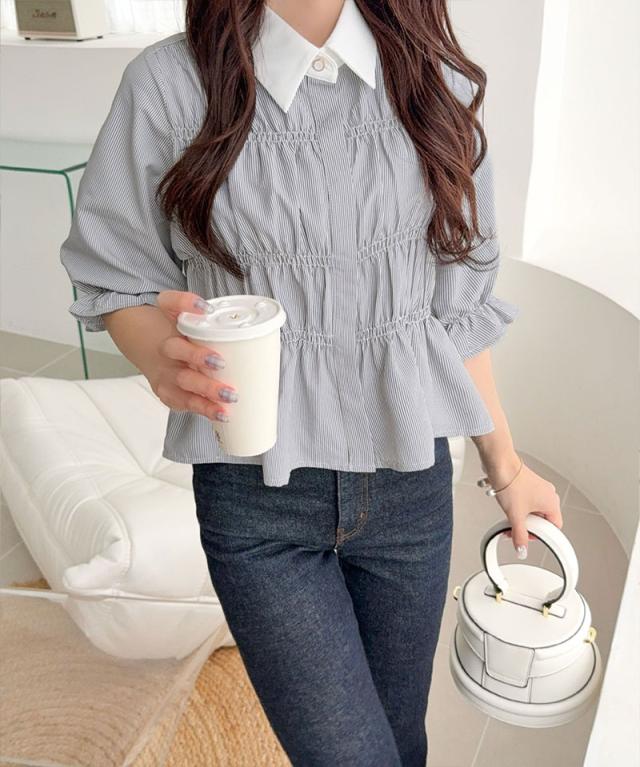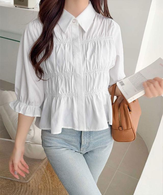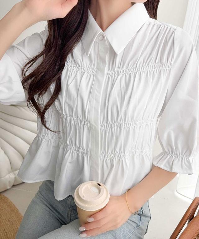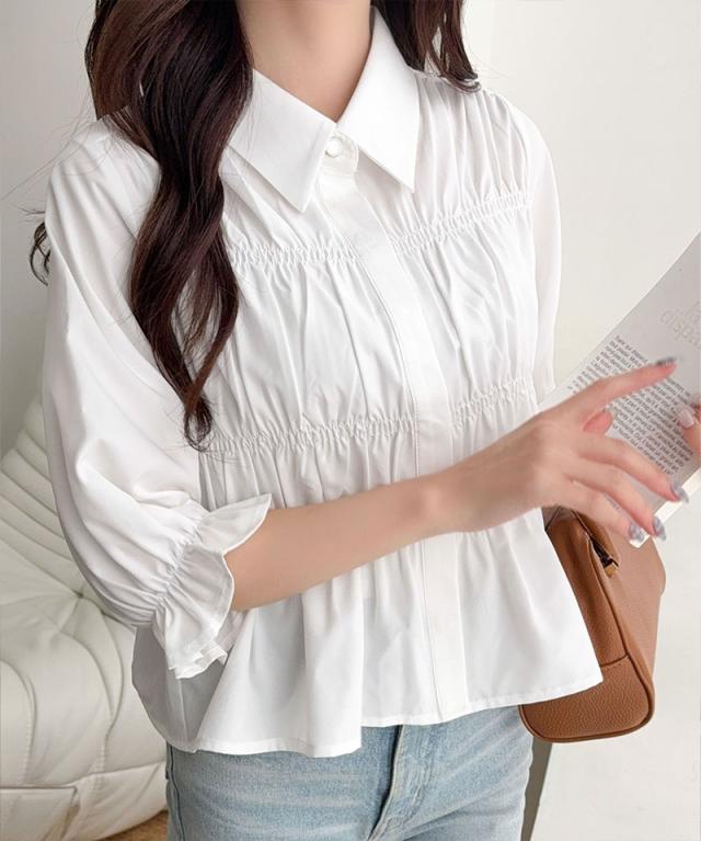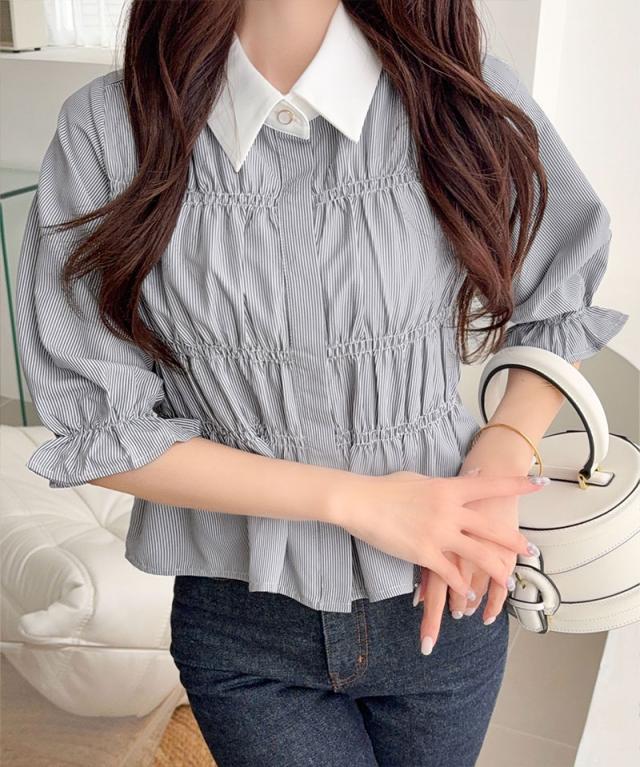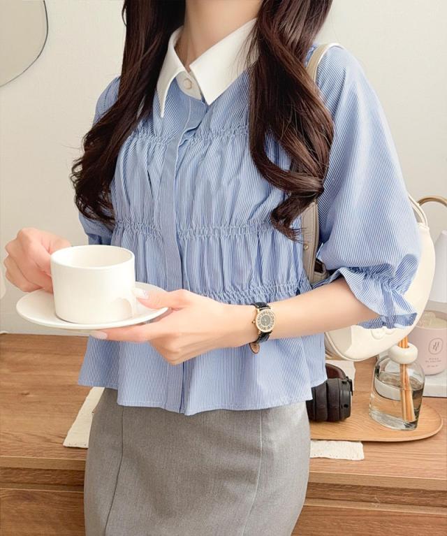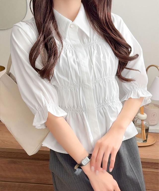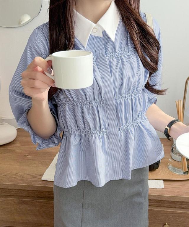 クラシカルエルフ春新作 mily bilet シャツブラウスレディース シャツ レディース おしゃれ トップス ガーリー 配色 襟 シャーリング ペプラ シャツ 半袖 キャンディスリーブ 二の腕カバー 大きいサイズ 2026ss mi1139107