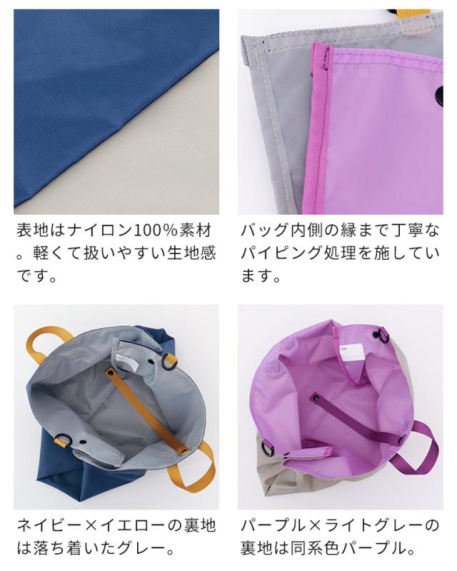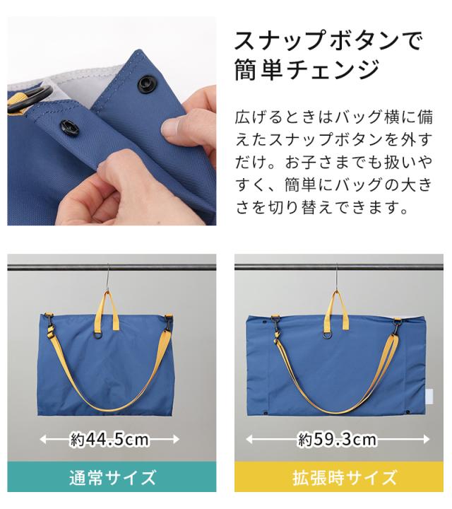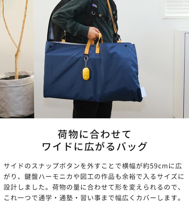 サイドのスナップボタンを外すと、横幅が広がるレッスンバッグです。通常サイズでは入りきらない鍵盤ハーモニカや、学校で制作した大きな作品も、拡張すればすっきり収納できます。生地には撥水加工を施しているので、雨の日も安心。ショルダーストラップ付きで、肩掛けと手持ちの2WAYで使い分けができます。