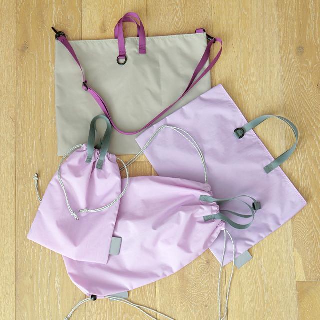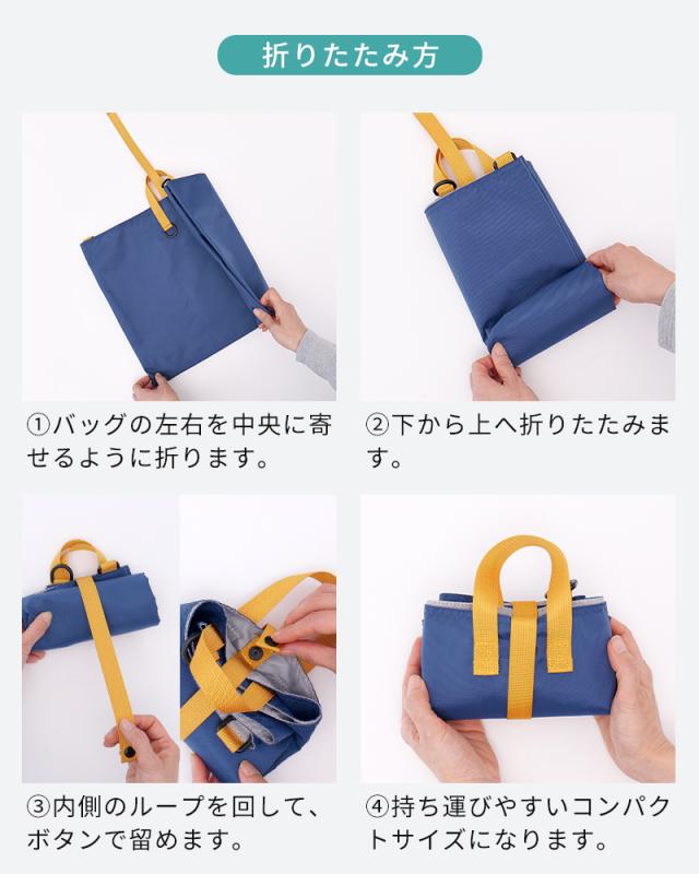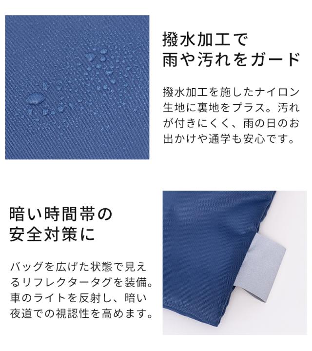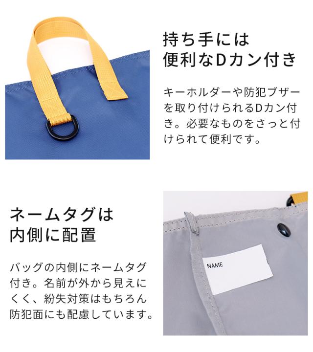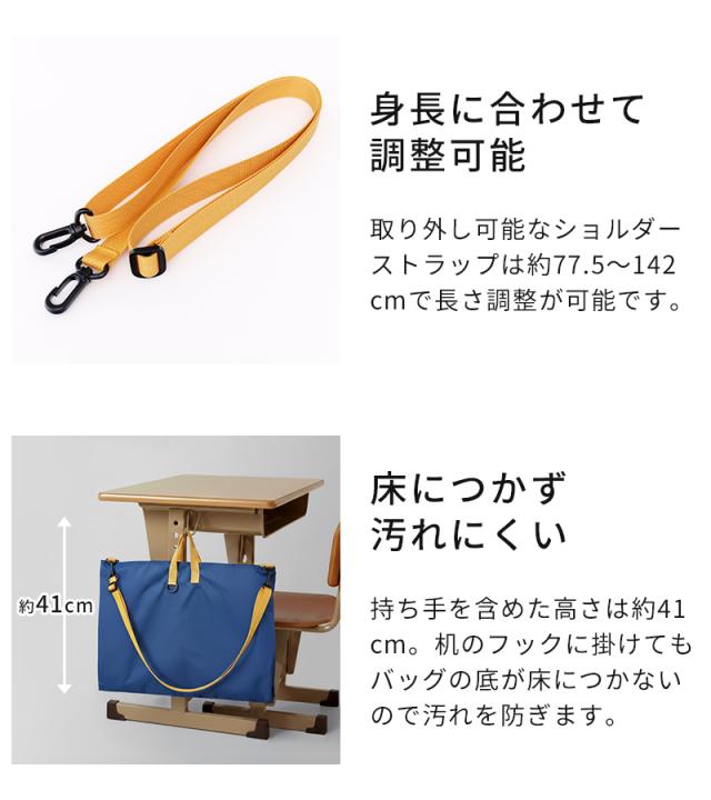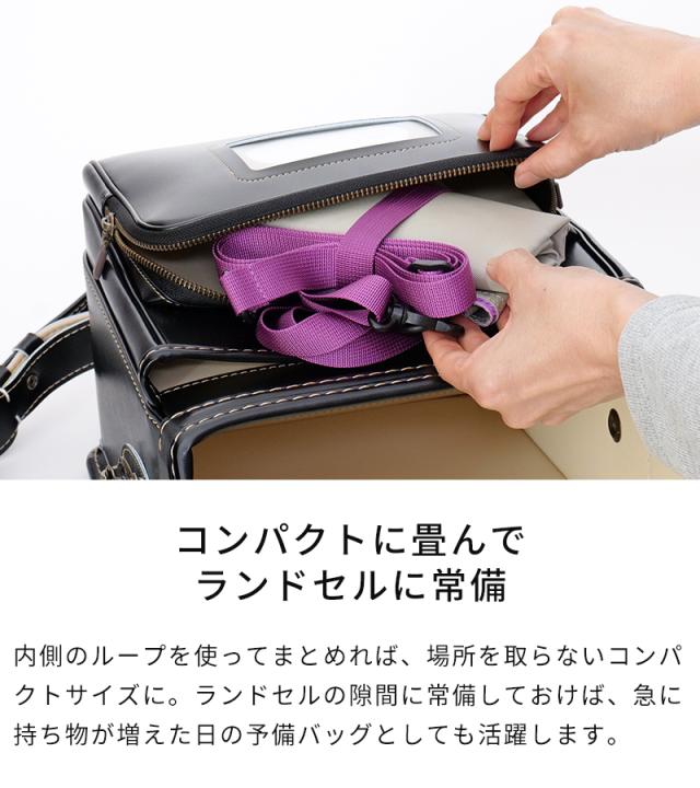 サイドのスナップボタンを外すと、横幅が広がるレッスンバッグです。通常サイズでは入りきらない鍵盤ハーモニカや、学校で制作した大きな作品も、拡張すればすっきり収納できます。生地には撥水加工を施しているので、雨の日も安心。ショルダーストラップ付きで、肩掛けと手持ちの2WAYで使い分けができます。持ち手は、机の横に掛けても底が床に付きにくい設計にこだわりました。コンパクトに折りたためるので、ランドセルに常備しておけば、急な荷物にも慌てない頼れる予備バッグとしても活躍します。