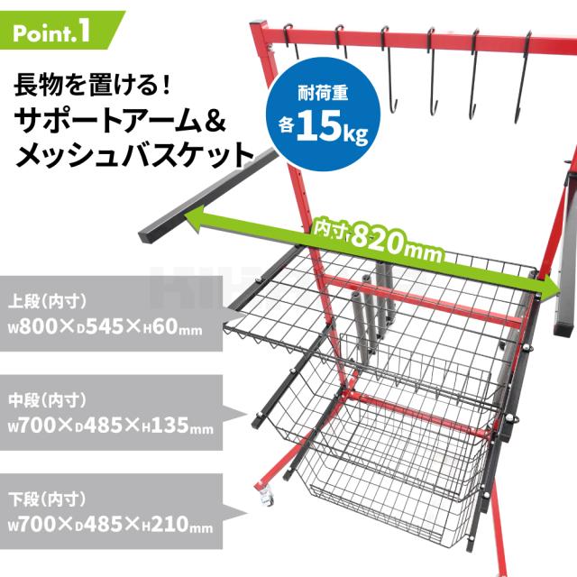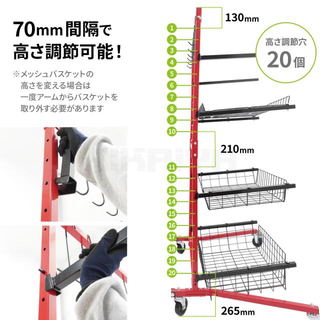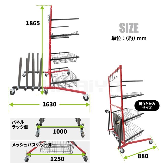 工場内の整理整頓に最適! ●車のバンパー、ドア、ライト等、様々なパーツを収納できるマルチラックです ●パーツの吊り下げが可能なフック6個付き ●サポートアーム、メッシュバスケットの高さやスタンドパイプの間隔はお好みで設置、調節が可能です ●パネルラックのスタンドにはスポンジがついており、立て掛けて置く物への傷を防ぐことのできる設計になっています ●移動が可能なキャスター付き 6つのキャスターはすべて自在で、うち4つはブレーキ付きです ●片側の脚は折りたたみ可能なので、使用しない時はコンパクトに保管できます ●お客様自身で組み立てが必要な商品です(20分〜30分/2人以上) 必要工具:スパナ(13mm×2・16mm・17mm)、プラスドライバー ※各収納箇所の耐荷重をよくご確認の上ご使用ください 品番:SET-BPSL |