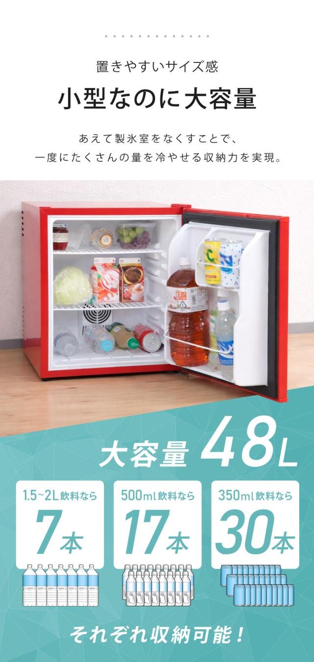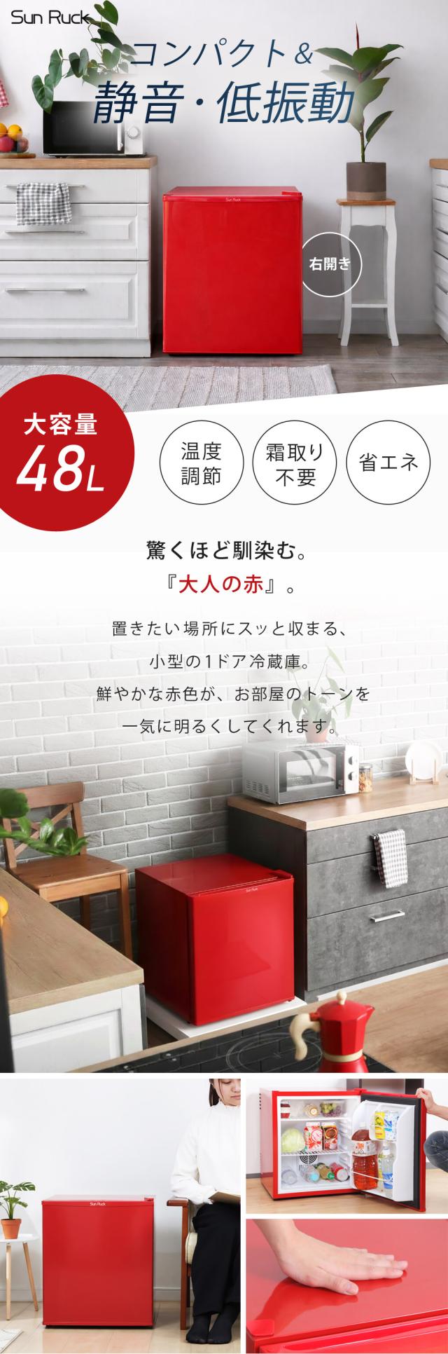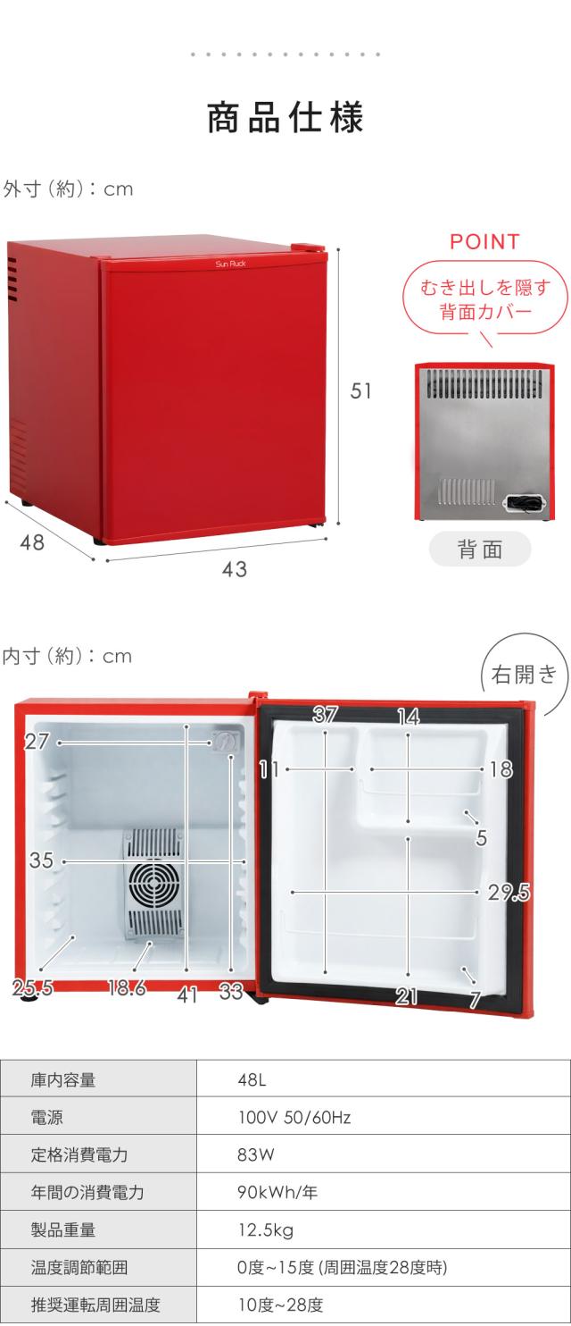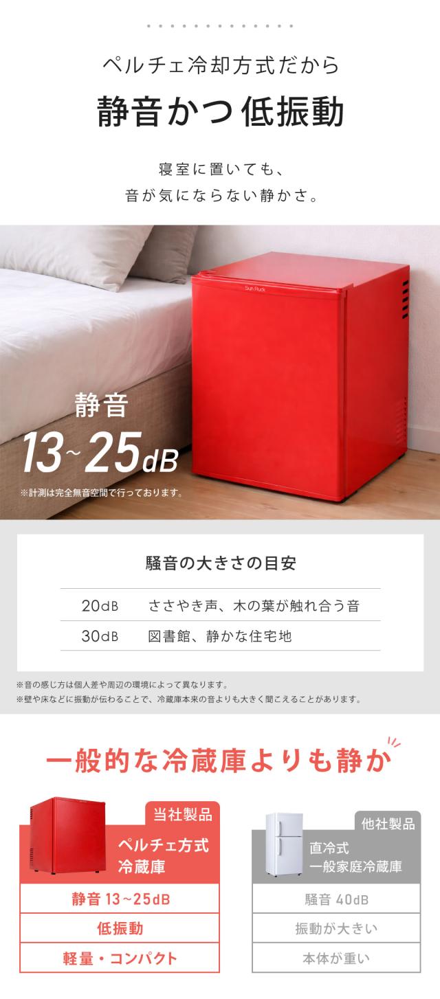 冷蔵庫 48L 小型 霜取り不要 低振動 静穏 13-25dB セカンド冷蔵庫 小型冷蔵庫 静音 ファン式 ファンタイプ 1ドア ペルチェ方式 フロストフリー 右開き ワンドア ミニ冷蔵庫 コンパクト おしゃれ 一人暮らし 新生活 赤 SunRuck サンルック