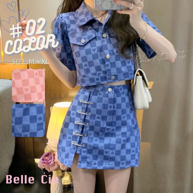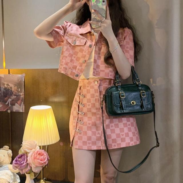 セットアップ スカート ジャケット 半袖 チェック ショート丈 夏 レディース クロップド 韓国ファッション 上下セット ブロックチェック ミニ丈