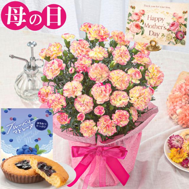 母の日 早割 プレゼント 2026 花とセット ギフト カーネーション ルナドリーム 鉢植え 選べる特典付き パキラ 抹茶どら焼き ブルーベリーマドレーヌ 四葉のクローバー球根 カレンダー付き 園芸専門店 吉本花城園