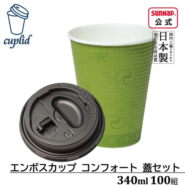 cuplid エンボスカップ コンフォート 340ml 蓋黒セット 100組【紙コップ ふた付き 断熱性 断熱カップ 耐熱性 耐熱カップ テイクアウト Lサイズ】