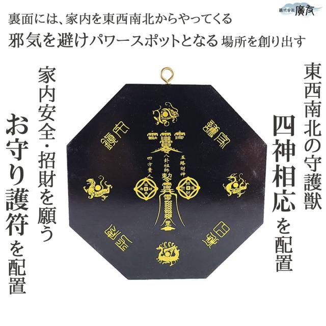 鏡の外側にある八角形の八卦により、全方位からやってくる邪気や殺気を祓い、羅盤が吉運を呼び寄せ、八卦の中央部に配された太極図が陰と陽のバランスをとり、平穏無事な生活をもたらしてくれると言われています。