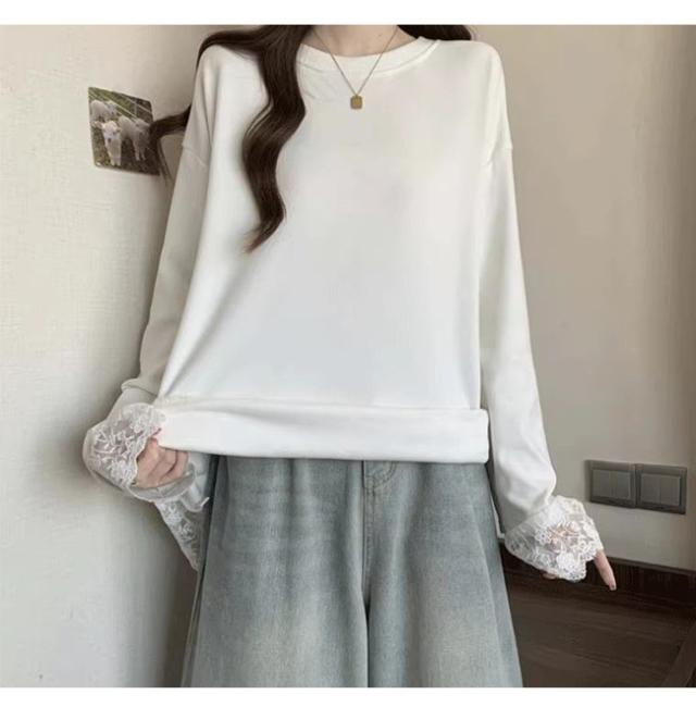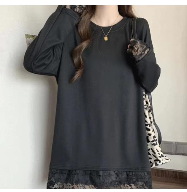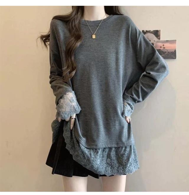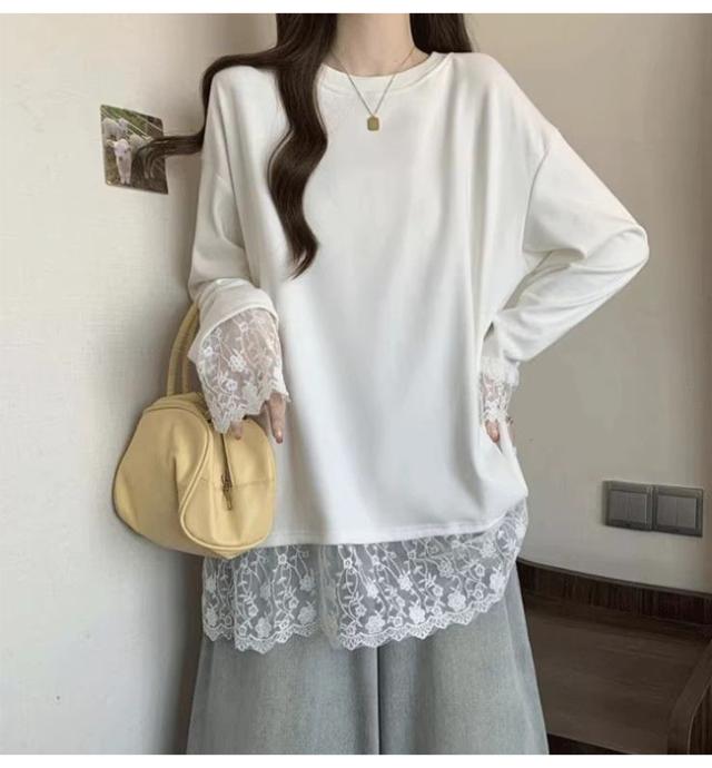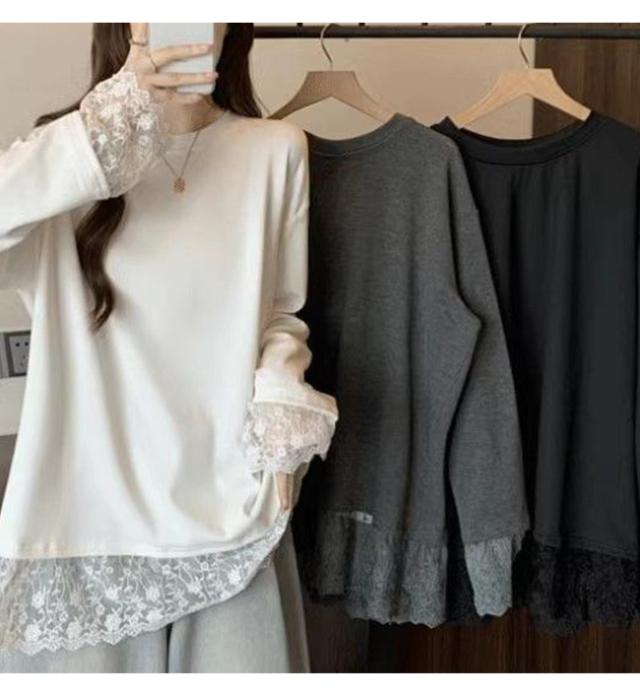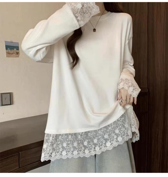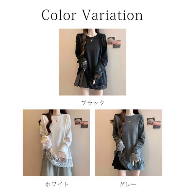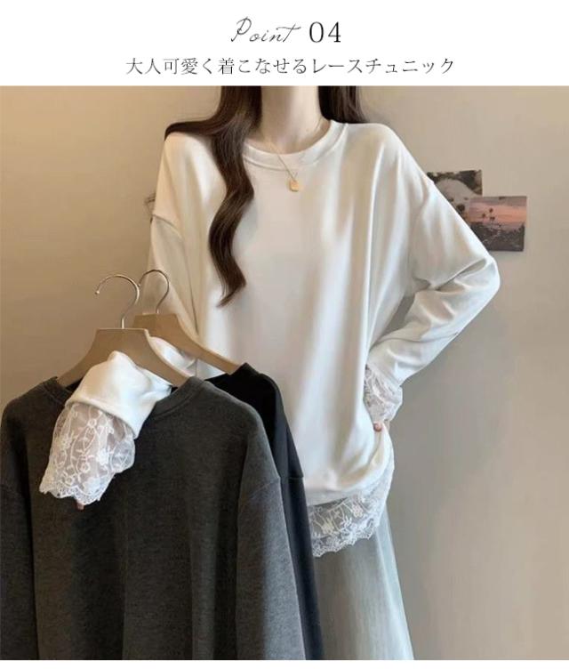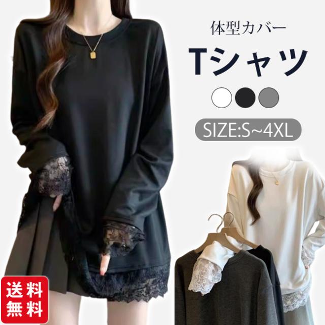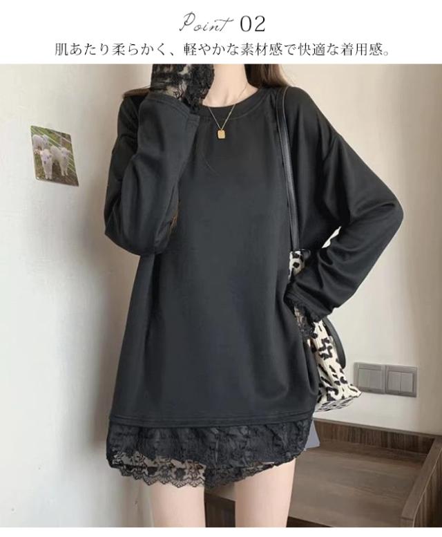 Tシャツ レディース プルオーバー トップス レース 体型カバー レーストップス 長袖 無地 クルーネック 春 秋 カジュアル ゆったり
