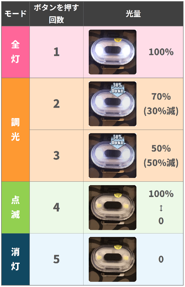 2回押すと70%、3回押すと50%、そして4回押すと点滅、5回押すと