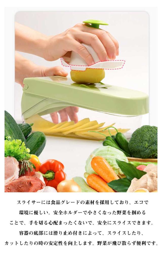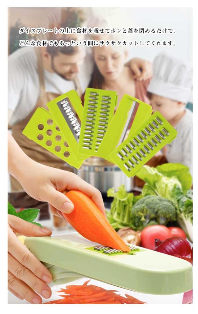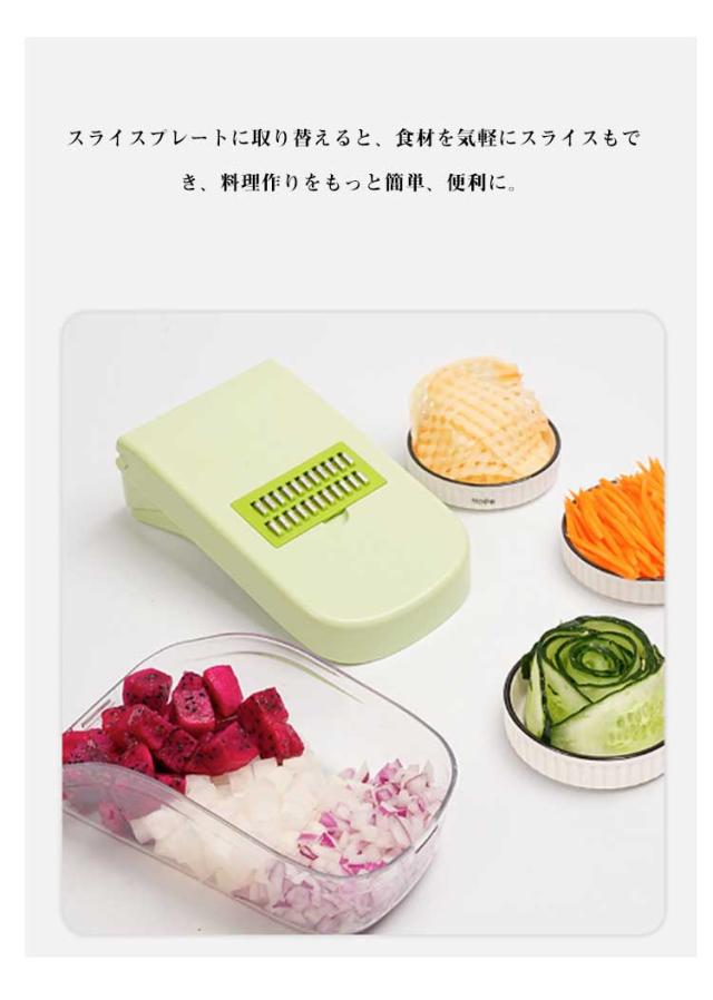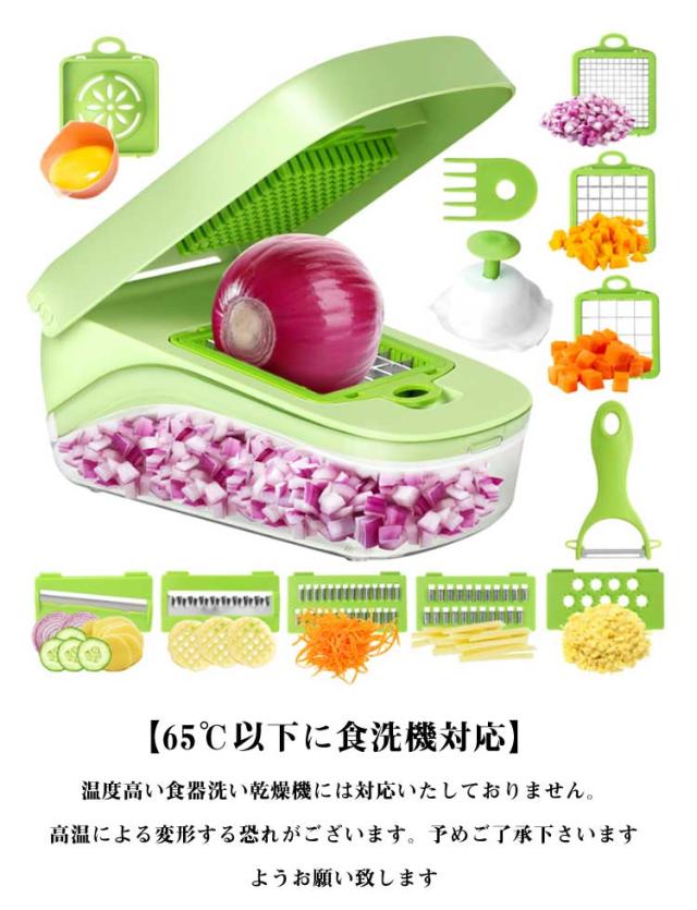 | これ一台で様々な調理ができる、マルチなスライサー!細目、粗目のカッターを使い分けて、お好みの大きさに野菜をカットできる。 料理の時間を大幅短縮するための万能調理器です。スライサーに鋭い切れ味のステンレス刃物を備えており、気軽に食材をスライスできます。ダイスプレートの上に食材を載せてポンと蓋を閉めるだけで、どんな食材でもあっという間にサクサクカットしてくれます。スライスプレートに取り替えると、食材を気軽にスライスもでき、料理作りをもっと簡単、便利に。 スライサーには食品グレードの素材を採用しており、エコで環境に優しい。安全ホルダーで小さくなった野菜を掴めることで、手を切る心配まったくないで、安全にスライスできます。容器の底部には滑り止め付きによって、スライスしたり、カットしたりの時の安定性を向上します。野菜が飛び散らず便利です。 【65℃以下に食洗機対応】温度高い食器洗い乾燥機には対応いたしておりません。 高温による変形する恐れがございます。予めご了承下さいますようお願い致します。 | |