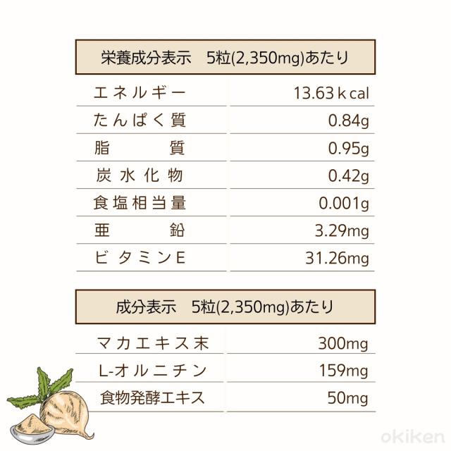 | 原材料名 | マカエキス末(マカエキス、マルトデキストリン)、L-オルニチン塩酸塩、食物発酵エキス(りんごを含む)、ビタミンE含有植物油、亜鉛含有酵母/ゼラチン、グリセリン、コメヌカロウ、グリセリン脂肪酸エステル、カラメル色素、植物レシチン(大豆由来) |
