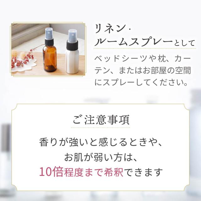 ルームフレグランスなどのほか、天然の化粧水としてもご使用いただけます。 皮脂バランスを整え、清涼感のある使用感です。お好みに応じて希釈してご使用いただけます。