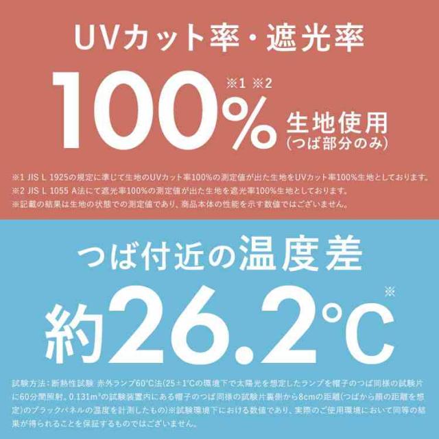 つば部分にはUVカット率100%・遮光率100%・UPF50+生地を使用し、強い日差しからしっかりガードします。