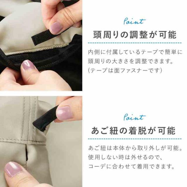 取り外し可能でアレンジ自在のあご紐付きなので、シーンやコーデに合わせて使い分けられます。