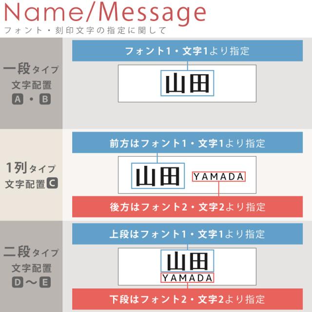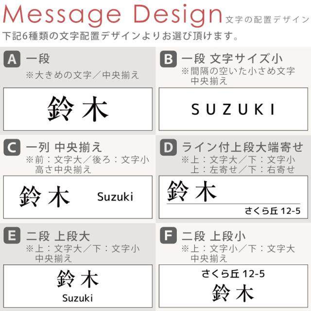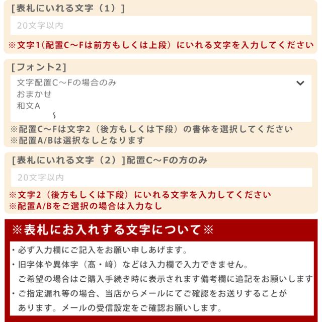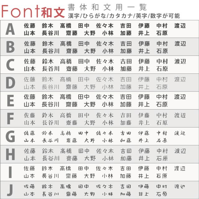 | ご注文に関しまして | ・名前部分の印刷は配置A・Bは1箇所、配置C〜Fは2箇所となります ・フォントから書体をお選びいただき、印字する文字(苗字や店名など)は入力欄に入力お願いします ・お名前の文字サイズやレイアウトはご希望の文字数やフォントによって、当店でバランスよく調整させていただきます。 ・旧字体や異体字など対応可能ですが、入力欄には入力できませんので、ご希望の場合は備考欄に 補足をご記入お願いします(ごく希に一部、製作できない漢字があります。) ・デザインの絵柄やカラーの変更などは致しかねます。文字のカラーはデザイン画の色となります。 ・複数個ご購入希望で、デザインが違う場合や名入れ内容が違う場合はお一つずつ買い物カゴへ追加してください。 ・モニターなどの環境によって色味が異なって見える場合がございます。 ・耐候性に優れた材料を使用しておりますが、天候(酷暑や寒波など)やご使用環境(沿岸部など)、 経年劣化によって材料が変色・変形、剥がれやすくなったり、気泡が出る場合があります。 ・お入れする文字(苗字や店名・住所など)の内容やご指定に不備があった場合、 当店からメールにてご連絡をお送りさせていただきます。 7日以内にメールの返信が確認できない場合、ご注文キャンセル処理をさせて頂きます。 必ずご注文の前にメールの受信設定のご確認をお願いします。 |