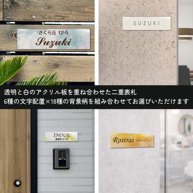 | 商品説明 | ご自宅のドア、マンション、会社などのネームプレートに! クリアアクリルとベース(ホワイト)アクリルを重ね合わせたカラーアクリル表札 細長 長方形タイプです。 透明のアクリルの内側に印刷を施すので印刷面も保護され、透明のアクリルによって奥行も感じられる表札です。 クリアアクリルで表面のツヤ感もあり、存在感も抜群!! シンプルな18種類の背景柄と6種の文字配置を組み合わせてお選びいただけます。 デザインだけでなく、フォント(書体)17種類、サイズは4種類から組み合わせていただけます。 表札としてだけでなく、店舗などの看板やインテリアのオブジェとしても!! 平面な場所にカンタンに取り付け出来るように両面テープとマグネットをお付けしてお送りします。 |