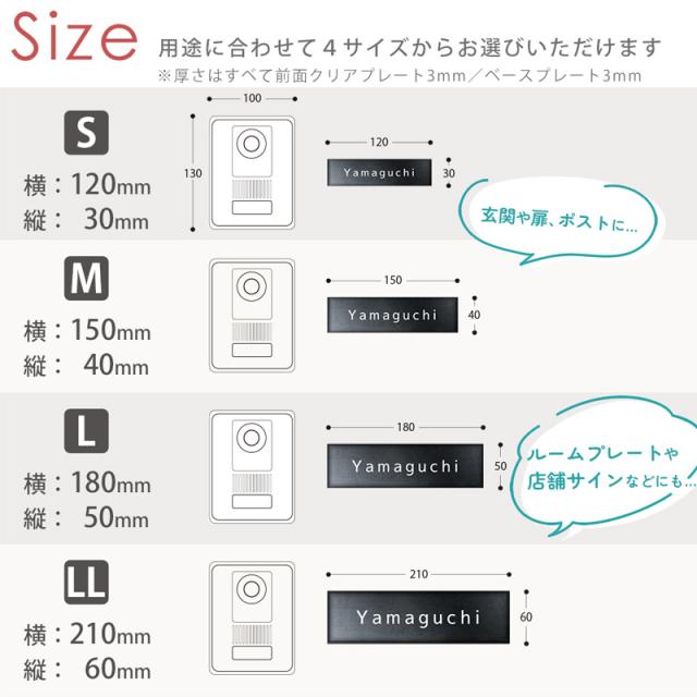 | プレートサイズ | Sサイズ:120mm×30mm Mサイズ:150mm×40mm Lサイズ:180mm×50mm LLサイズ:210mm×60mm 厚さ クリアアクリル 3mm/ベースアクリル(白)3mm 計6mm |