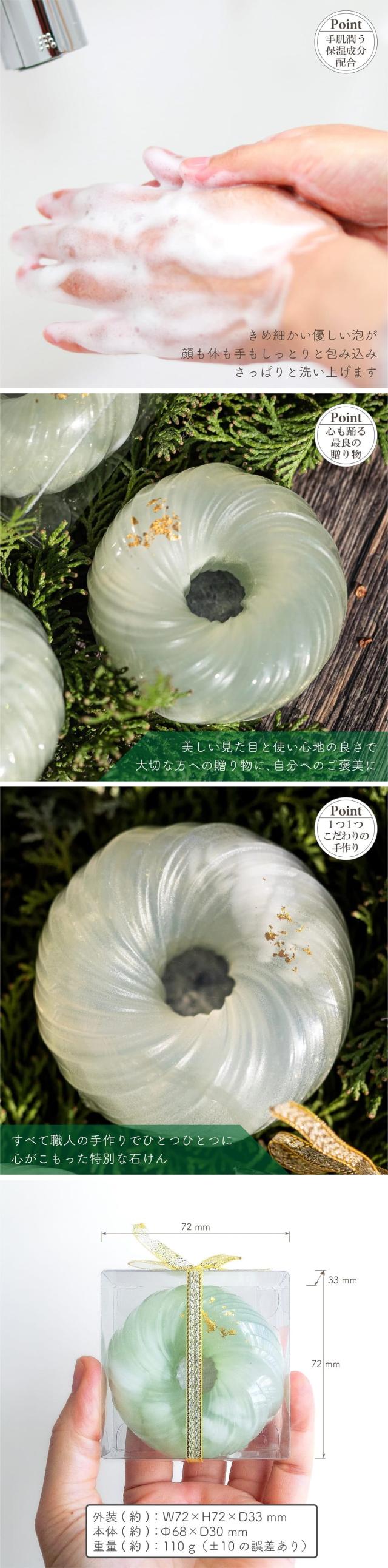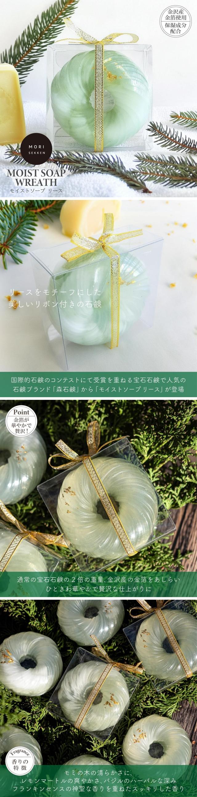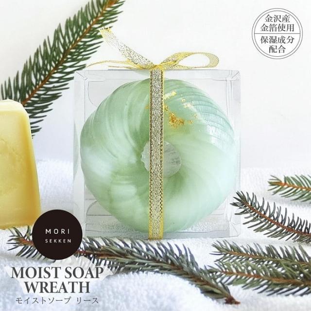 石けん 森石鹸 モイストソープ リース 110g 金沢産金箔 リボン付クリアケース入り 茅ヶ崎産 ハンドメイド 少量生産 グリーン モミの木 レモンマートル バジル フランキンセンス アロマ 固形石鹸 ハンドケア いい香り かわいい おしゃれ 母の日 ギフト 贈り物 プレゼント