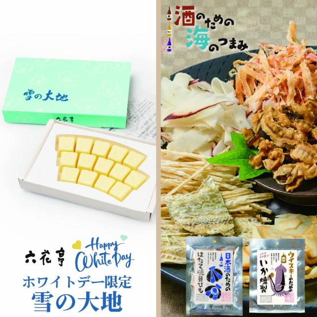 | 内容量 | 六花亭 雪の大地×2個と酒のための海のつまみ(帆立・いか燻製)×各1個のセット |