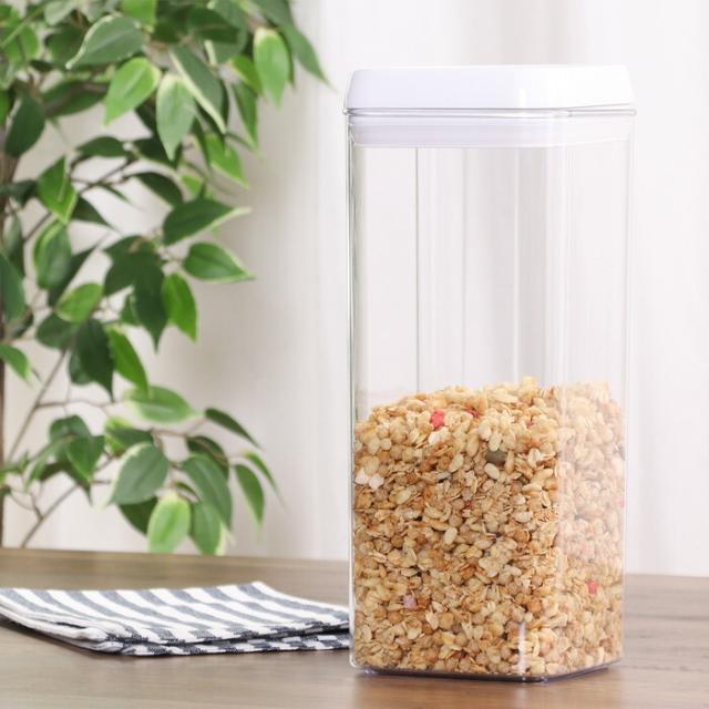 完成品片手で簡単に開閉可能!スタッキングロックキャニスター 3100ml落としても安心、軽くて使い勝手のよいデザインです。片手で簡単に開け閉めでができるプルタブ式です。蓋のレバーを押すと蓋がしっかり閉まり、湿気をや酸化を防ぎます。透明でしっかり中身が見えるので、取り出したいものも一目瞭然。作業効率UPです。広口デザインなので中身の出し入れが簡単。また内部のお手入れも楽にすることができます。食品を詰め替えて、容器を統一するだけでおしゃれな見た目のキッチンに。