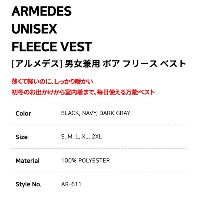 【ARMEDES】アルメデス ボアベスト 送料無料 メンズ レディース フリース ベスト ボア チョッキ ジップアップ 前開き もこもこ 防寒着 軽量 暖かい 内ポケット アウトドア ゴルフ 部屋着 秋冬 男女兼用 AR611