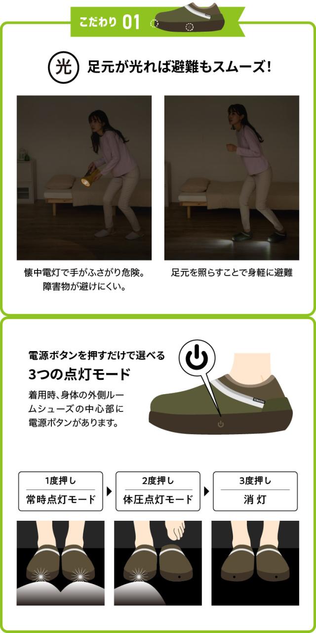 SONAENO 防災ライトルームシューズ (送料無料) 防災シューズ 防災靴 LEDライト付き ルームシューズ 履くと光る 安全靴 防災サンダル 防災アドバイザー 高荷智也 監修 災害対策 防災グッズ 室内履き 防災 ルームスリッパ 普段使い