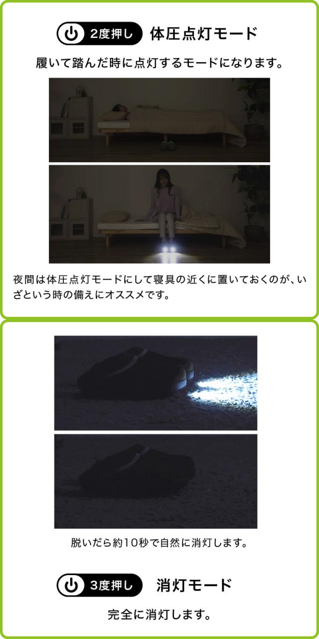 踏むと光る体圧センサー入り防災用ルームシューズ。