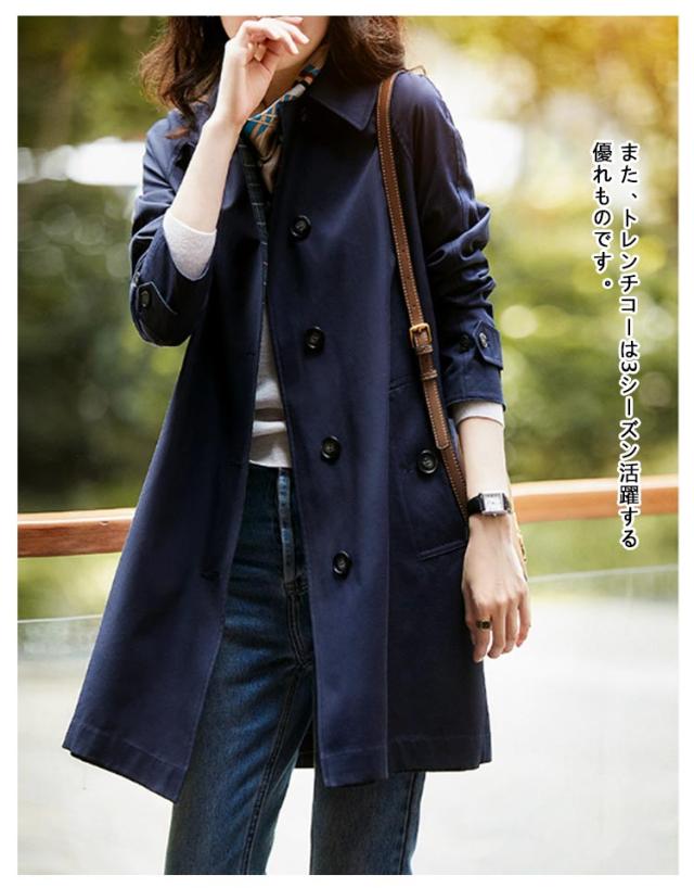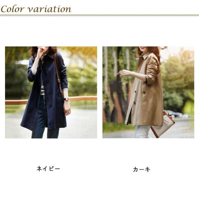 | ネイビー・カーキ/7サイズ! シンプルですっきりとした印象が魅力の大人スプリングコート。 また、トレンチコーは3シーズン活躍する優れものです。 ゆったりとしたシルエットで、重ね着をしてももたつかず、すっきりとした印象に しわになりにくく、自宅で洗濯可能なところも嬉しいポイント。 ハリがありながらも、動きやすさと綺麗さを損なわないシルエットが魅力。 スウェットやデニムなどと合わせてカジュアルなスタイリングも、きれいめなアイテムとのコーディネートでも、オンオフ兼用で幅広く着回せるアイテムです。 | |