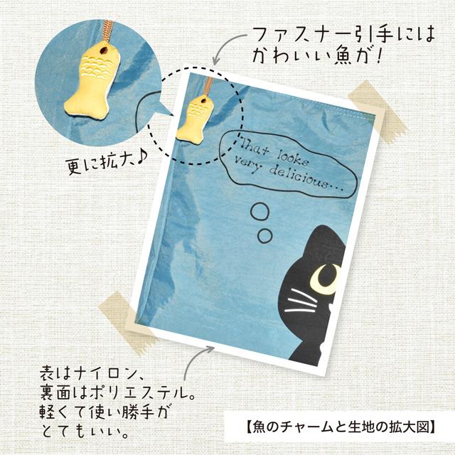 猫ちゃんがファスナーの引手に付いている魚のチャームを狙っているようなデザイン♪