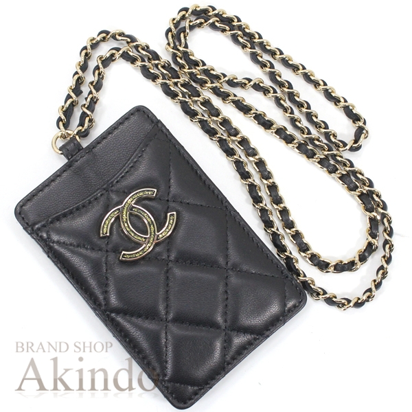 【新品同様】シャネル チェーンカードケース カードホルダー ネックストラップ付き チェーンネックレス ラムスキン 黒 ブラック ココマーク A01745 キルティング マトラッセ パスケース IDカード カードケース 定期入れ CHANEL