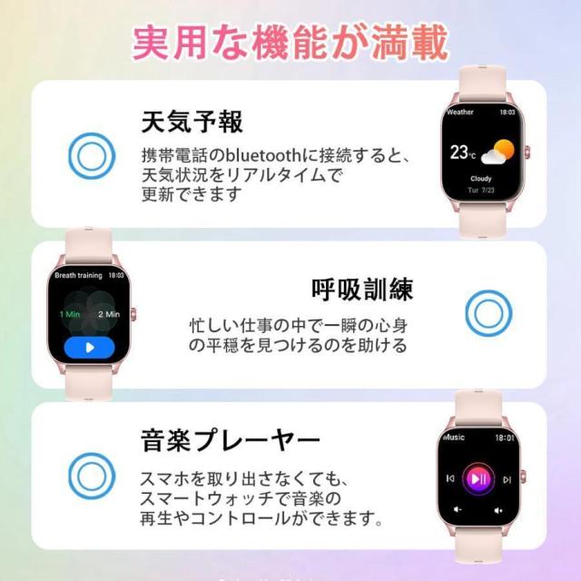 革新技術によって低消費&エネルギーチップとBluetooth 5.2通話機能を搭載し、ウォッチを使って電話に出たり、直接電話をかけたりできます。運転、家事、運動中で両手を解放し、より便利に〜また、音声アシスタント対応可能で、スマホを出さなくても、スマートウォッチの 音声アシスタント画面でSiriを呼び出し、すごく便利。着信履歴のチェック、連絡先登録、ダイヤルパッド付き、運転中、運動中などスマホをすぐに取り出せない状況でも大事な着信を逃しません。また専用アプリに連絡先を追加すると、ウォッチで追加したリストを表示され、リストから電話もかけます。天気予報、女性の生理、音楽制御、ストレステスト、スマホを探す、長居注意、呼吸訓練、懐中電灯、スマートストップウォッチ、電卓などの各種ユーティリティが付属しており、日常生活を便利にします。