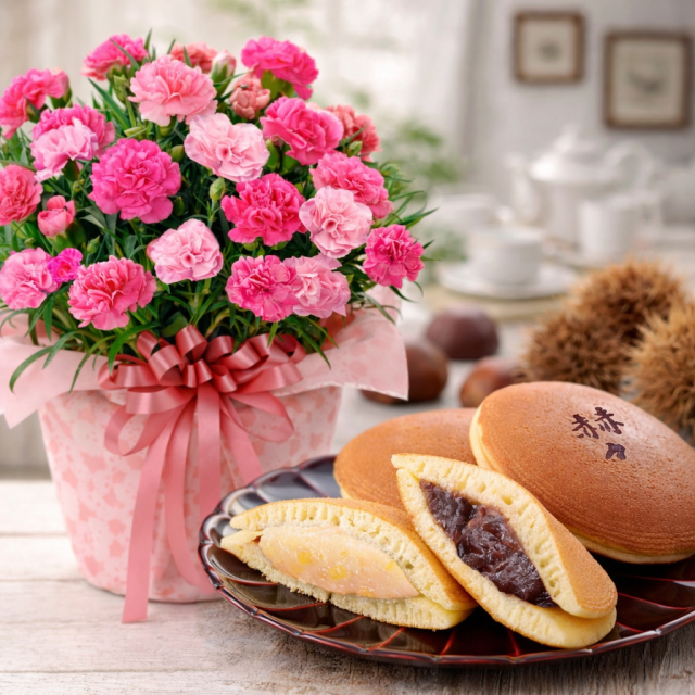 母の日 花とセット 生どら焼き「赫々」と カーネーション さくらもなか 花とスイーツ プレゼント お菓子付き 60代 70代 80代 のお母さんにおすすめ 送料無料