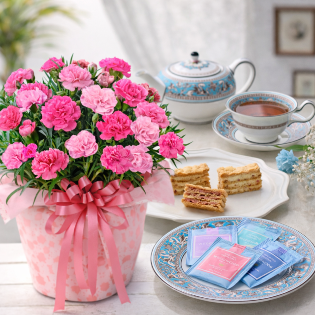 母の日 花とセット ミルフィーユとウエッジウッドティーセットと カーネーション さくらもなか 花とスイーツ プレゼント お菓子付き 60代 70代 80代 のお母さんにおすすめ 送料無料