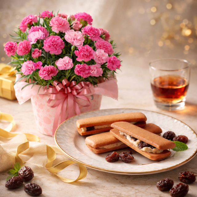 鮮やかに咲くカーネーションの鉢植えに、プレミアムなお菓子を組み合わせた、華やかで気持ちの伝わるセット。
