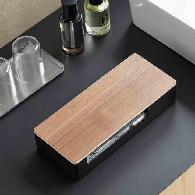 天然木の温もりと梨地のスチールの上質感が調和したアメニティボックスで、置くだけで洗練された空間を演出。宿泊施設などの備品としてはもちろん、ご自宅で使えばホテルライクな空間に。本体表面は、ユニクロメッキと粉体塗装仕上げで錆びにくくなっています。底面はシリコーンゴム付きで設置場所のキズつきを防止。滑り止めにもなり、安定して使えます。