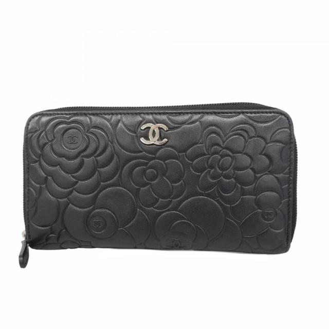 ★SALE【6ba1145-k】シャネル 長財布 カメリア ラムスキン ブラック シルバー金具【中古】レディース