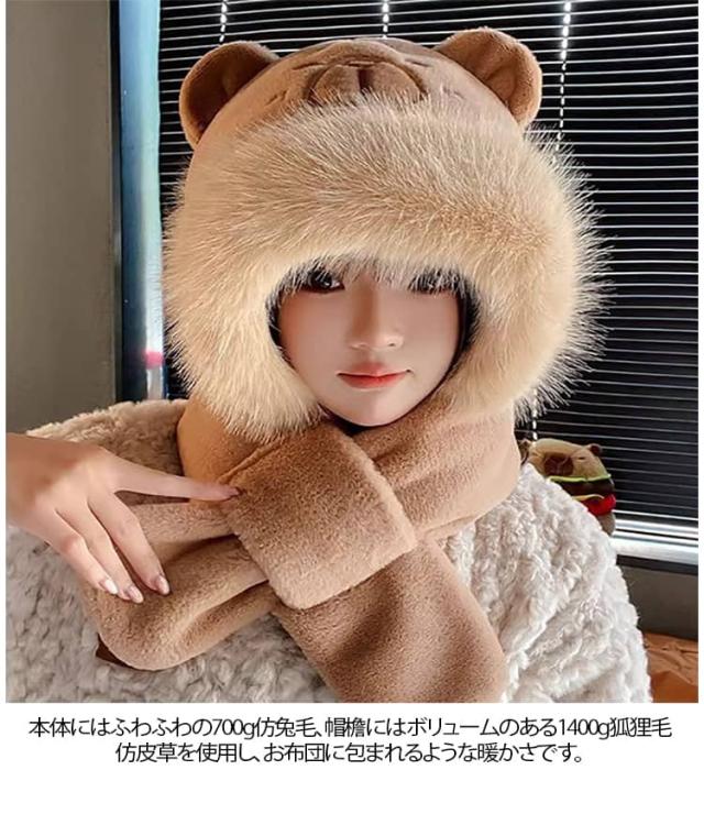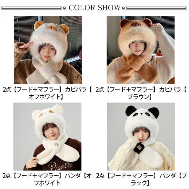 | ふわふわ・もこもこの優しい手触りが魅力の、パンダ/カピバラデザインの帽子・マフラー一体型あったかアイテムです。 頭・耳・首まわりを360°包み込む設計で、冷たい風をしっかりガード。 通学・自転車・お散歩など、冬のお出かけに最適です。 2点セット(帽子+マフラー)と、3点セット(帽子+マフラー+手袋)の2タイプをご用意しております。 本体にはふわふわの700g?兔毛、帽檐にはボリュームのある1400g狐狸毛?皮草を使用し、お布団に包まれるような暖かさです。 | |