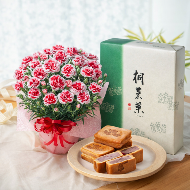 鮮やかに咲くカーネーションの鉢植えに、プレミアムなお菓子を組み合わせた、華やかで気持ちの伝わるセット。