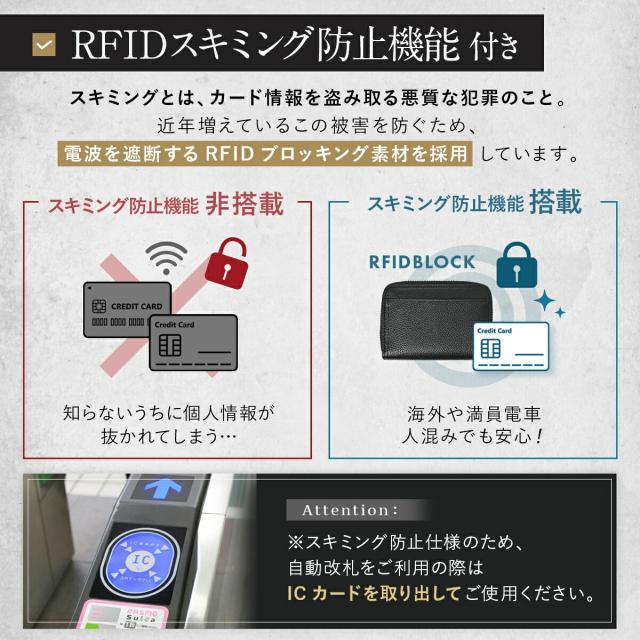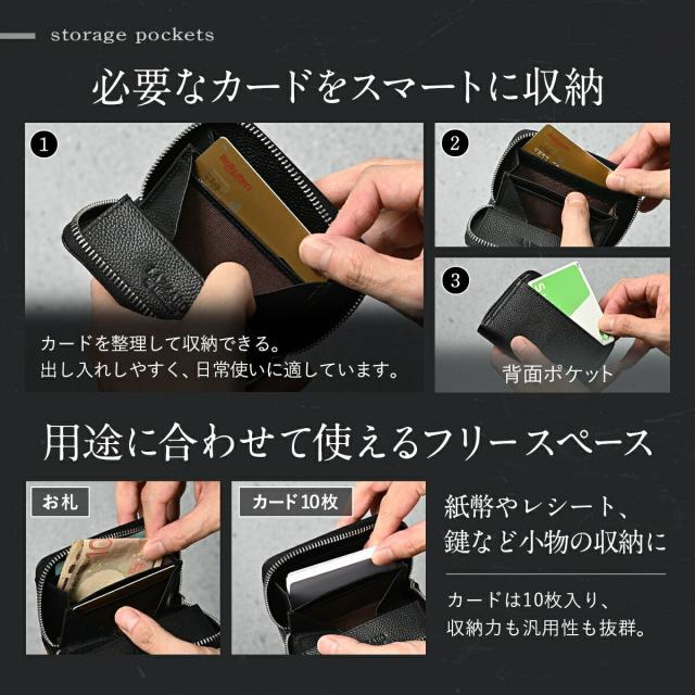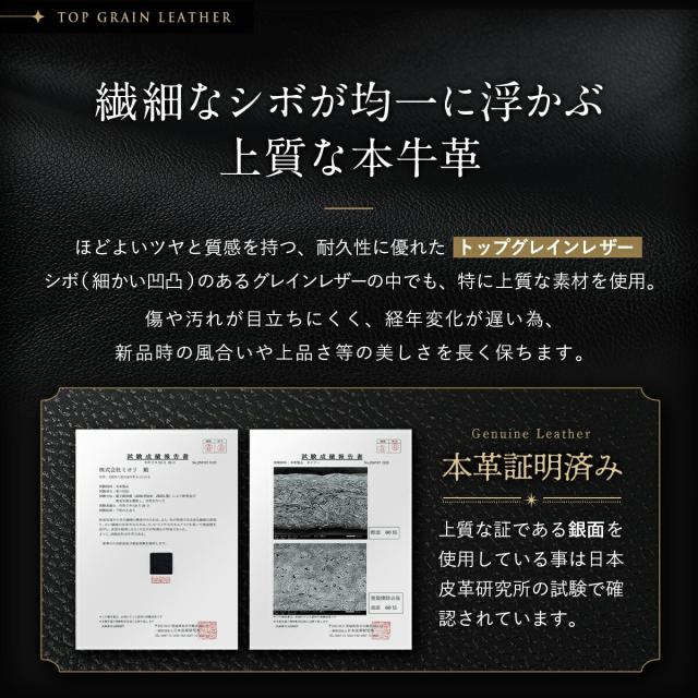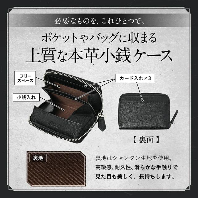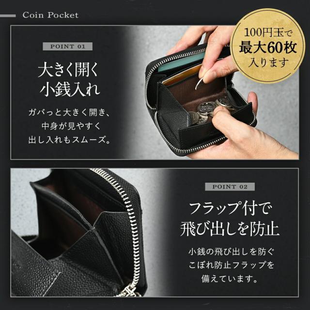 【1. 上質な素材と洗練されたデザイン】 本革の中でも高級ランクに分類される**トップグレインレザー(牛本革)**を贅沢に使用。 繊細で均一なシボが美しく浮かび、革本来の自然な表情と深みのある色味が魅力です。 派手さを抑えた落ち着いたカラートーンで、年齢・性別問わず使える上品な印象に仕上げています。 さらに、日本皮革研究所の試験により銀面革であることが確認された高品質素材を採用。 傷や汚れが目立ちにくく、経年変化もゆるやかなため、長く美しさを保てます。 【2. コンパクトなのに充実した収納力】 手のひらサイズのコンパクトさを保ちつつ、必要なアイテムをスマートに持ち運べる収納設計。 ・小銭入れ:大きく開いて中身が一目で見える視認性の高さ。100円玉なら最大約60枚収納可能。 こぼれ防止フラップ付きで、持ち歩き時の不安も軽減。 ・カードポケット×3枚分:よく使うカードをスマートに収納 ・フリースペース:紙幣・レシート・小物などを自由に収納。カードなら約10枚入る幅広サイズ メイン使いはもちろん、サブ財布やミニマル派にもぴったりのアイテムです。 【3. 高級感と機能性を支えるディテール】 裏地には、適度なハリと耐久性を兼ね備えたシャンタン生地を採用。 内部の形状が整いやすく、型崩れしにくいため、見た目の美しさと使いやすさが両立しています。 開閉には、信頼のYKKファスナーを使用。 スムーズでストレスのない開閉を実現し、日々の使用にも安心感を与えてくれます。 【4. セキュリティ機能で安心の持ち運び】 カード情報を狙ったRFIDスキミング被害の対策として、RFIDブロッキング素材を内蔵。 クレジットカードやICカードの情報を、不正な電波からしっかりガードします。 ※スキミング防止機能により、ICカードは収納したままタッチできません。 セキュリティと利便性のバランスを考慮した設計です。 【5. サイズ・重量・ギフト対応】 サイズ:横11.0cm × 縦8.0cm × 厚み2.5cm 重量:約87g 素材:牛本革(トップグレインレザー)/裏地:シャンタン生地 高級感ある専用ギフトボックス入りで、贈り物としても最適。 誕生日、記念日、父の日・母の日・クリスマスなど、特別なシーンでのギフトにも自信を持っておすすめできる逸品です。 |