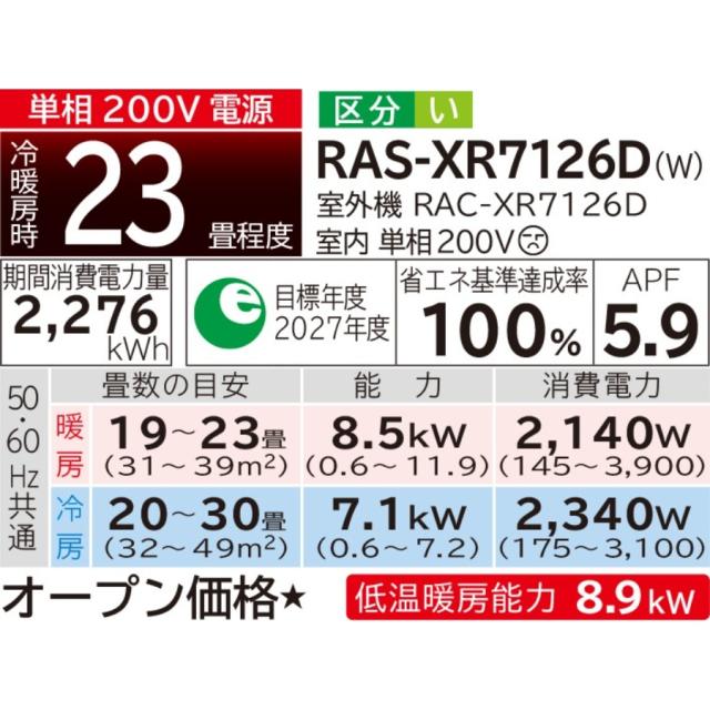 エアコン 23畳用 日立 白くまくん プレミアムXシリーズ 7.1kW 単相200V RAS-XR7126D-W ルームエアコン スターホワイト 2026年度モデル