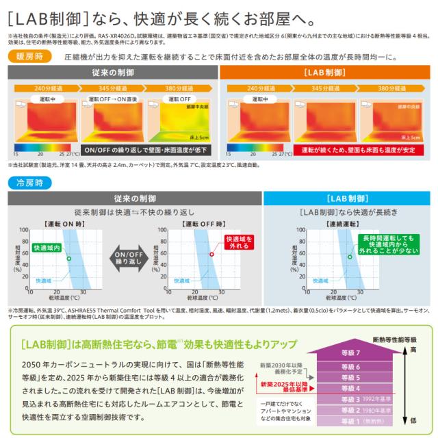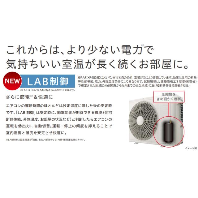 エアコンの運転時間のほとんどは設定温度に達した後の安定時です。「LAB制御」は安定時に、節電効果が期待できる環境(住宅断熱性能、外気温度、お部屋の状況など)と判断したらエアコンの運転を低出力に自動切替。運転・停止の頻度を抑えることで室内温度と湿度を安定させ快適に。