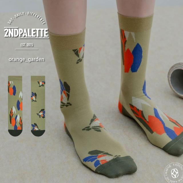 オレンジガーデンは、自然の庭園を思わせる有機的な色彩と、遊び心あふれるデザインが魅力のレディースソックスで、日常のコーディネートにさりげない個性と華やぎを添えてくれる一足です。