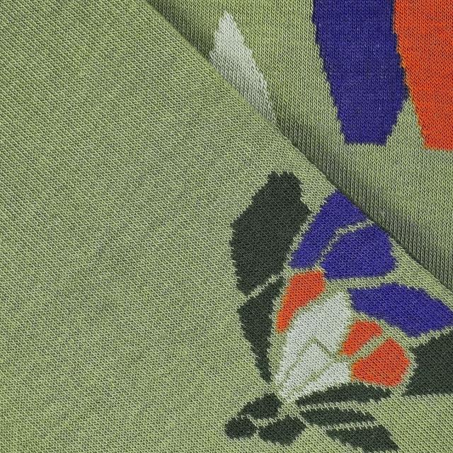黄緑をベースカラーに、左右非対称に配置された鮮やかなオレンジやブルーのアクセントが印象的で、まるで絵画のような美しい配色が足元を明るく彩り、シンプルな装いのワンポイントとしても存在感を発揮します。