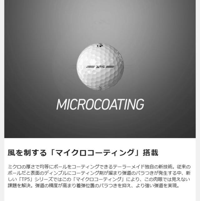 従来のボールだと表面のディンプルにコーティング剤が溜まり弾道のバラつきが発生する中、新しい「TP5」シリーズではこの「マイクロコーティング」により、この肉眼では見えない課題を解決。