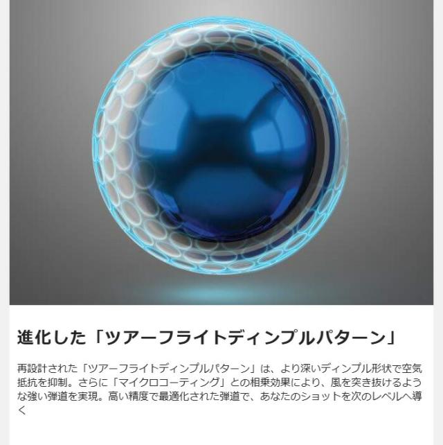 進化した「ツアーフライトディンプルパターン」 再設計された「ツアーフライトディンプルパターン」は、より深いディンプル形状で空気抵抗を抑制。 さらに「マイクロコーティング」との相乗効果により、風を突き抜けるような強い弾道を実現。 高い精度で最適化された弾道で、あなたのショットを次のレベルへ導く。